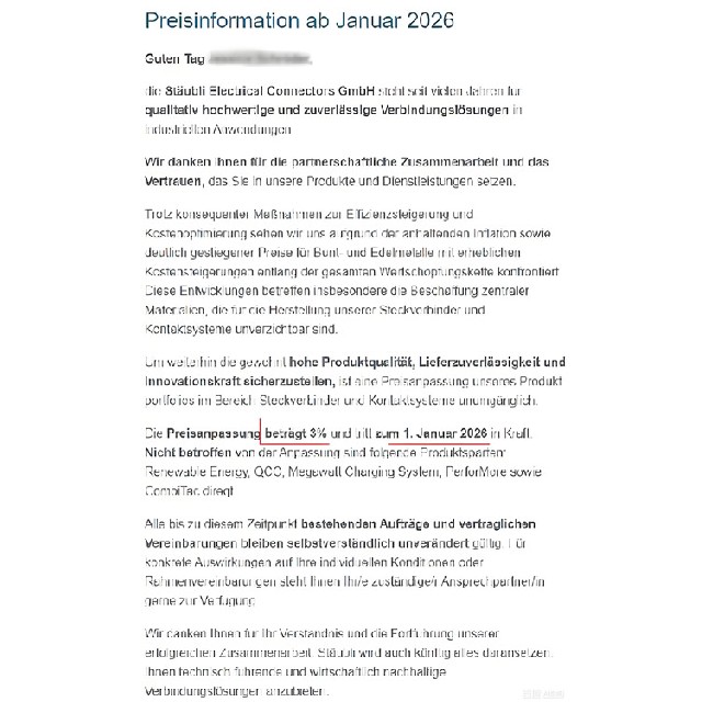 尊敬的客户:史陶比尔电气连接器有限公司(Stäubli Electrical Connectors GmbH)多年来始终为工业应用提供高品质、可靠的连接解决方案。我们感谢您对我们产品与服务的信任及合作。尽管持续采取提高效率和优化成本的措施,但由于持续的通货膨胀,以及有色和贵金属价格的显著上涨(涉及整···