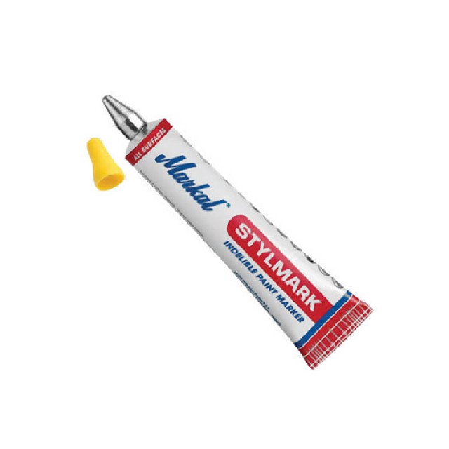 Markal Stylmark Original 是一款金属球形笔尖,用于大多数表面的标记。铝制挤压管和厚漆使其适用于粗糙、垂直和顶置表面,在油性和潮湿表面上附着力极佳。无二甲苯油漆能降低用户健康风险。